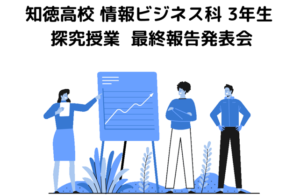 1月7日に、情報ビジネス科3年の課題研究発表会を行いました。情報ビジネス科の3年生は2年生の2学期から、加和太建設様、LtGスタートアップスタジオ様、NPO法人みしまびと様の協力による探究授業「起業とまちづくり」に取り組んできました。授業では毎回、加和太建設、LtG、みしまびとの担当者が伴走してくださいました。この授業は、自らの好きを起点に課題を見つけ、問題を解決する手法を学び、自ら考え行動することの喜びや重要性を認識し、今後の人生を自ら切り開くことができる人材を育成することをねらいとしています。今回のタイトル「『好き』から始まる 火力は無限大」は担当の方の言葉です。この日、11チームが自らの好きを起点に新たな視点で考えた課題解決策やビジネスプランを、地元の企業や金融機関、保護者にプレゼンしました。