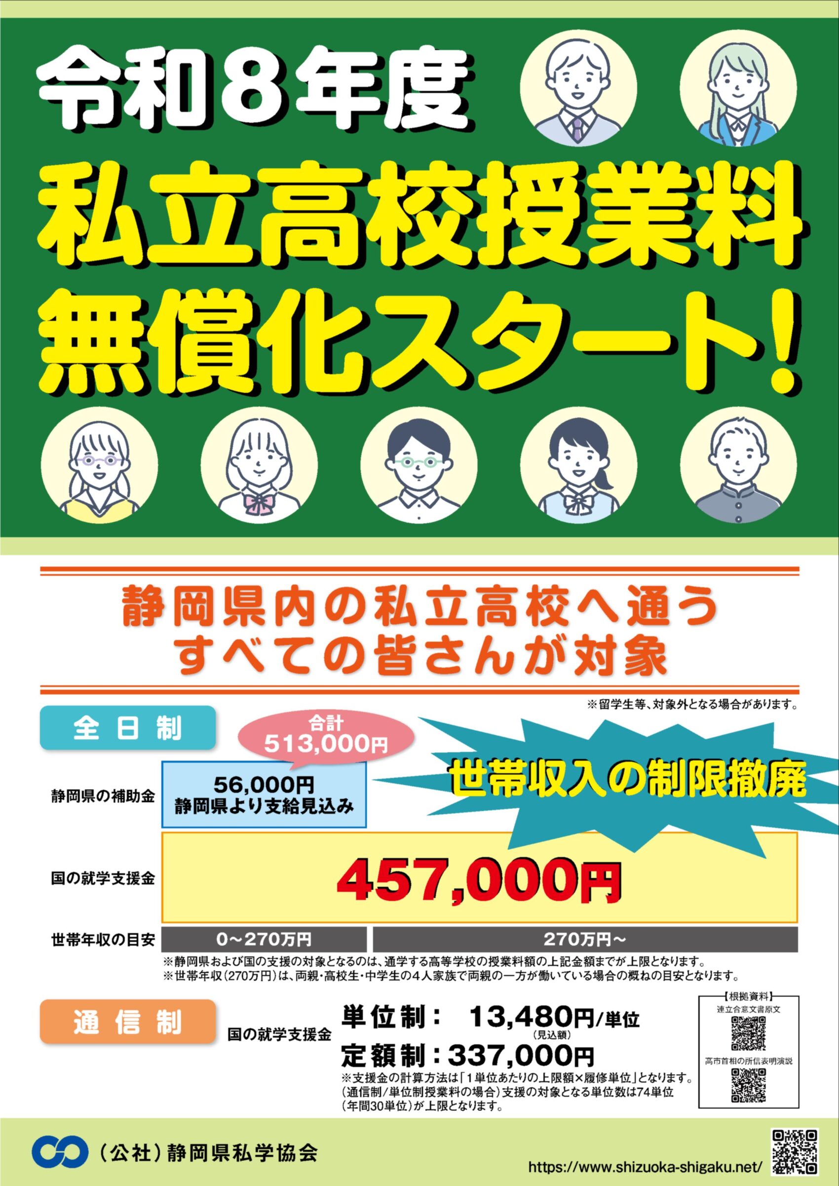 令和8年度から私立高校の授業料が実質“無償化”されます。詳細は画像にてご確認ください。
