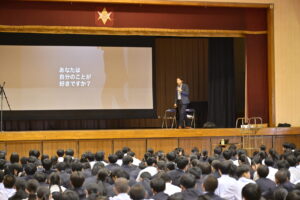 新入生とその保護者を対象に「できたことノート」講演会を開きました。講師はできたことノートの開発者、永谷研一さんです。できたことノートは、毎日の小さな「できたこと」を書きとめて、提出したり発表したりする中で、互いにたたえ合い、自己肯定感を高め、新たな行動につなげようとするものです。