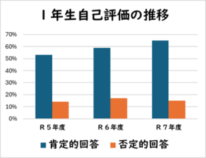 できたことノートを開始して3年目。教員もだいぶ慣れてきて、生徒の実態に合った使い方ができるようになってきました。おかげさまでこの3年間、生徒の自己肯定力に関する自己評価は肯定的な回答の割合が増えています。