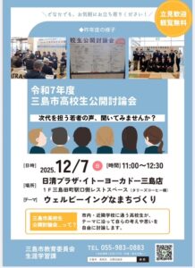 三島市高校生公開討論会は、12月7日(日)にイトーヨーカドー三島店1F三島田町駅側レストスペースで、11:00~12:30に行われます。立ち見歓迎の観覧無料ですので、ぜひお立ち寄りください。